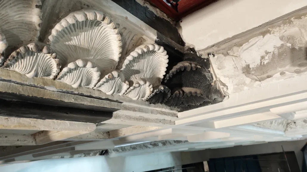 A restaurálás közel egy éven át tartott, és mintegy 500–600 négyzetméter műemléki felületet érintett. Az egyik legnagyobb feladatot a mennyezeti kagylósor pótlása jelentette, mivel az eredeti elemek nagy része megsemmisült. A helyszínen kialakított műhelyben készült el az új ornamentika, amely azonnal beépíthető volt. Ugyanakkor egy három méteres eredeti szakaszt tanúfelületként megőriztük, hogy a látogatók összehasonlíthassák a múlt és a jelen közötti különbséget.